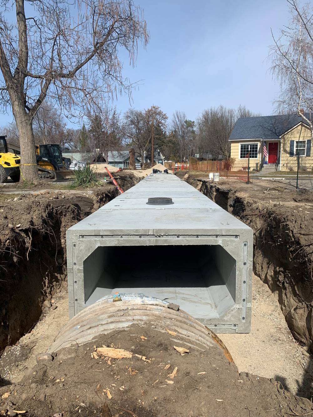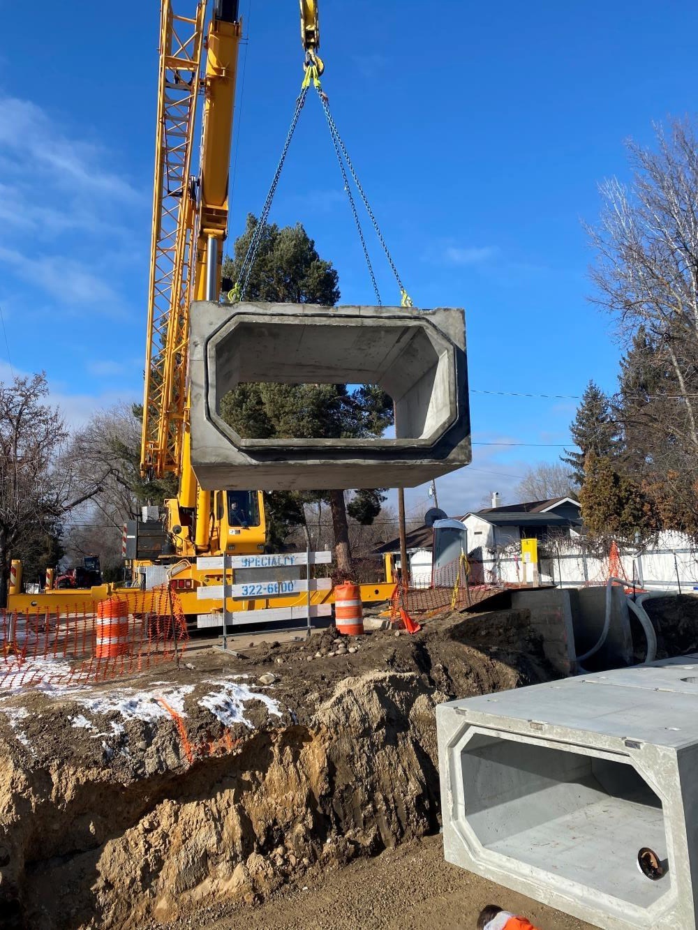 This project was publicly bid in fall of 2021, Peak Concrete was awarded this project by ACHD and was able to complete on time and on budget paving in spring on 2022. This project was to replace an old CMP culvert and replace with a 10'x8' inside diameter precast box culvert produced by Old Castle in Nampa, ID. Once the box was set by excavation, Peak then had a closure pour for a cast-in-place flume on top of the box culvert, providing flow for another canal.