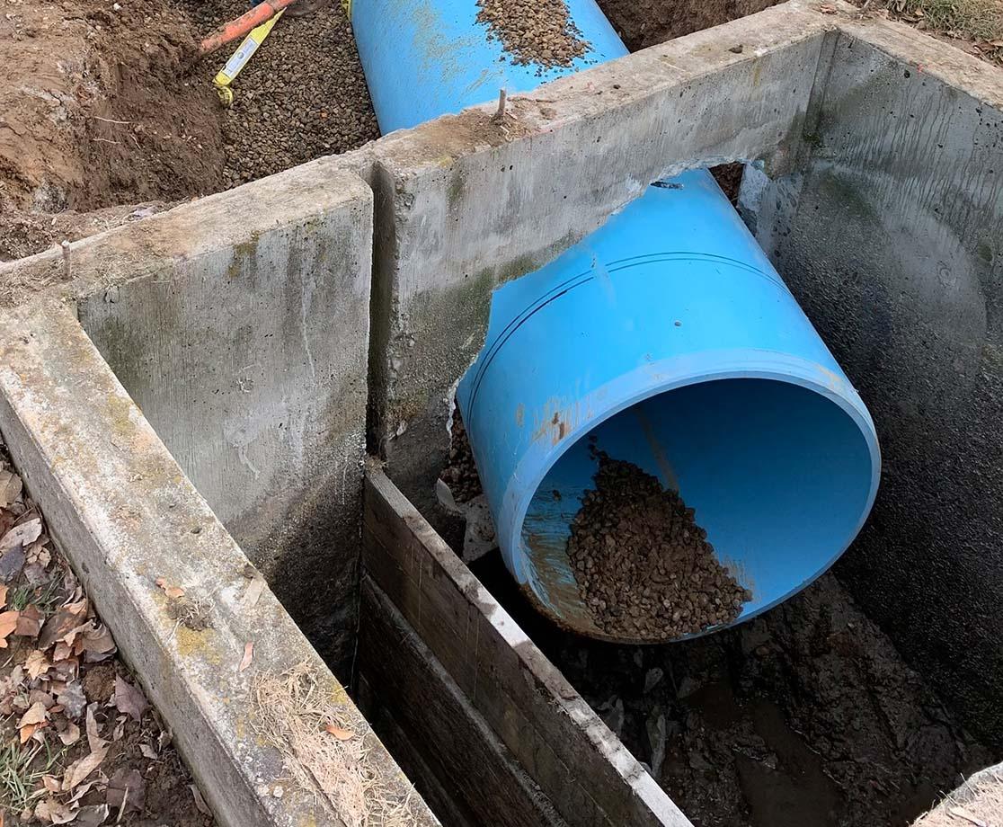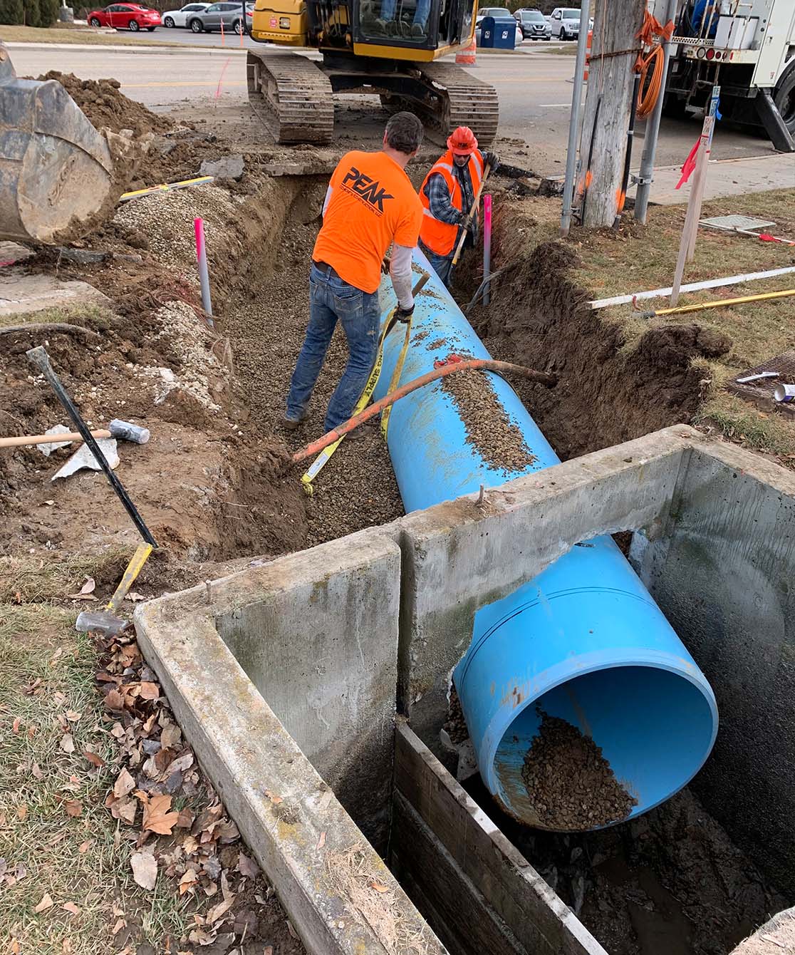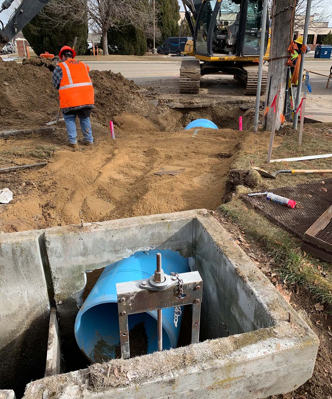 Peak was able to do all of the removals of concrete, unsuitable material, import of aggregate, installation of new 30” pipe, setting of the new irrigation box, and asphalt and concrete prep. While Peak Concrete provided all the curb, gutter, sidewalk, and closure pours in order to finish the job.