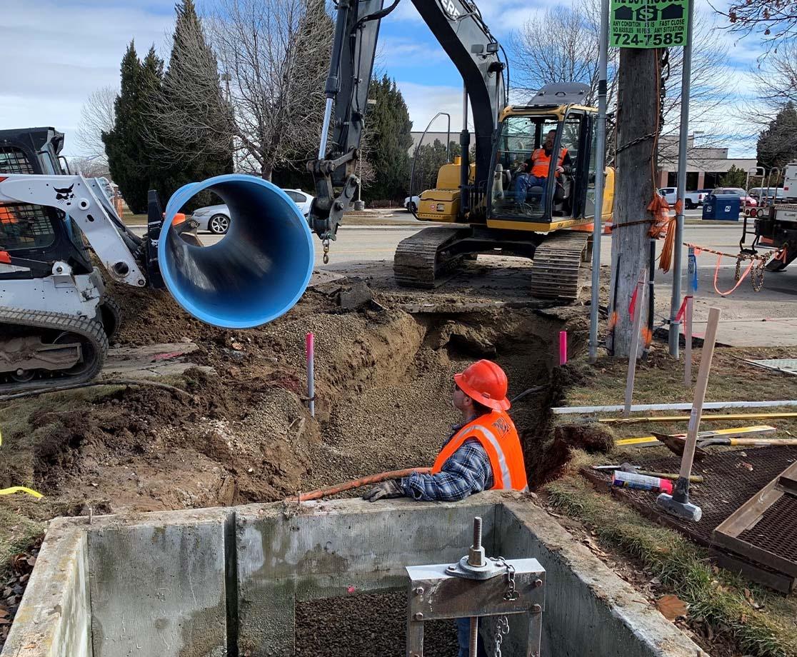 An Ada County Highway District project awarded in early 2021, was designed for a new pedestrian crossing and crosswalk as well as an upgrade to the existing irrigation line running across 5 Mile Rd and Smoke Ranch Dr. Peak Concrete Construction’s scope included new curb, gutter, sidewalk, new 30” C900 PVC pipeline from an existing irrigation box across 5 mile road connecting into a new irrigation box and then running the same 30” line across Smoke Ranch Dr. Also included on this job was electrical for the new pedestrian crossings, erosion control, traffic control and striping.